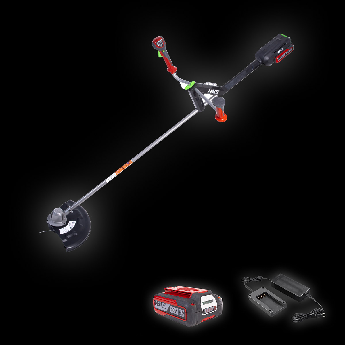 The HENX 40 Volt Li-Ion Bike Handle String Trimmer combines cordless convenience with exceptional working time. The Bike Handle design provides perfect balance, comfort, and precision. This trimmer features a high-efficiency brushless motor, a 350mm cutting swath, a bump-head string feed, and a professional 2.4mm nylon cutting line to finish the job fast and easy. The 40-Volt Lithium-ion battery delivers Gas-like Power and is compatible with all HENX 40V products and chargers.